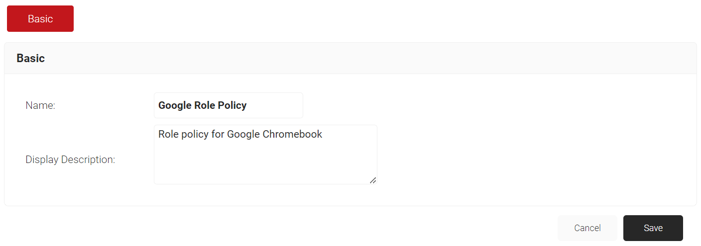 - Under the Basic section, in the Name field, enter the name of the role policy.