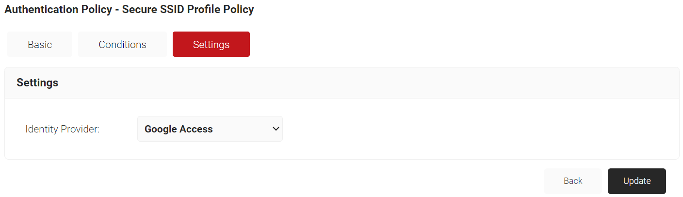 An Authentication Policy connects an IdP with a Network Profile. This is necessary so only our Google-managed Chromebooks can connect to our network. We will need to configure an Authentication Policy to tie the Network Profile we just created, with the Google Verified Access IdP that we made at the beginning of the document.