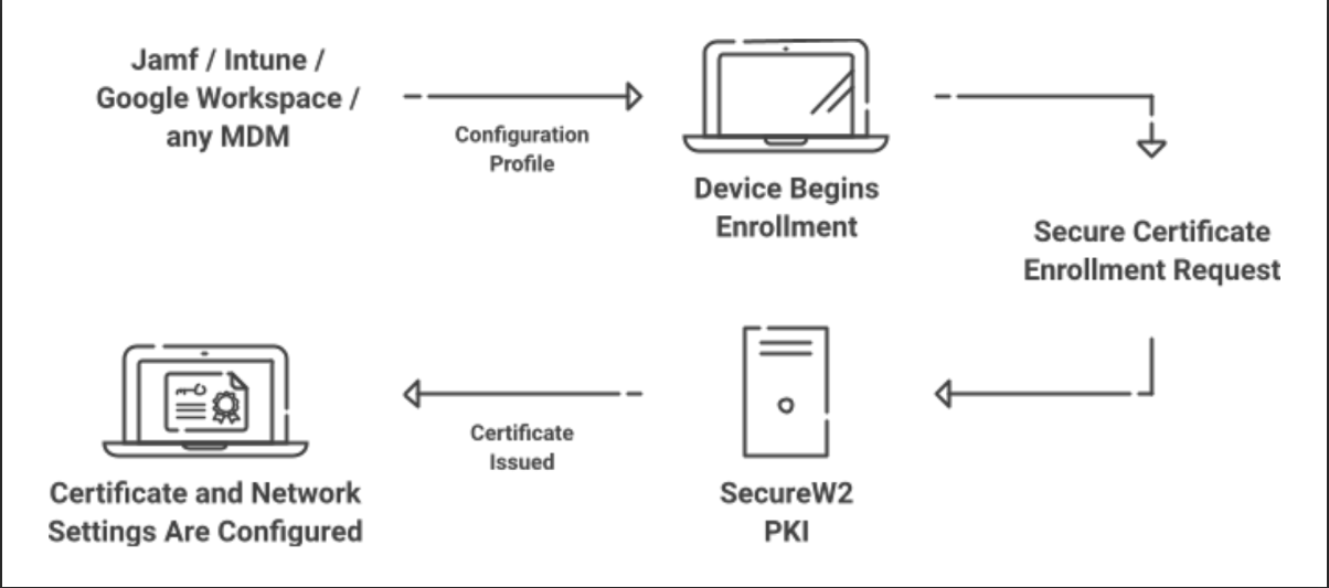 SecureW2s JoinNowConnector PKI offers a variety of ways to enroll devices for certificates. It offers an onboarding application that enables unmanaged devices to self-service themselves for certificates. It also offers Managed Device Gateways, shown in this document integrating with Google Workspace, to help manage the certificate lifecycle for your organization. This enables admins to auto-enroll, revoke or renew certificates seamlessly and in a more secure manner that is up-to-date with the information that exists in their MDM.