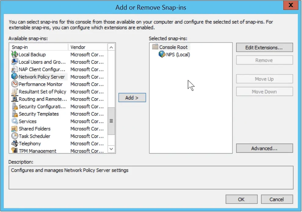 - In the Add/Remove Snap-ins window, select Network Policy Server from the Available snap-ins, and click Add.