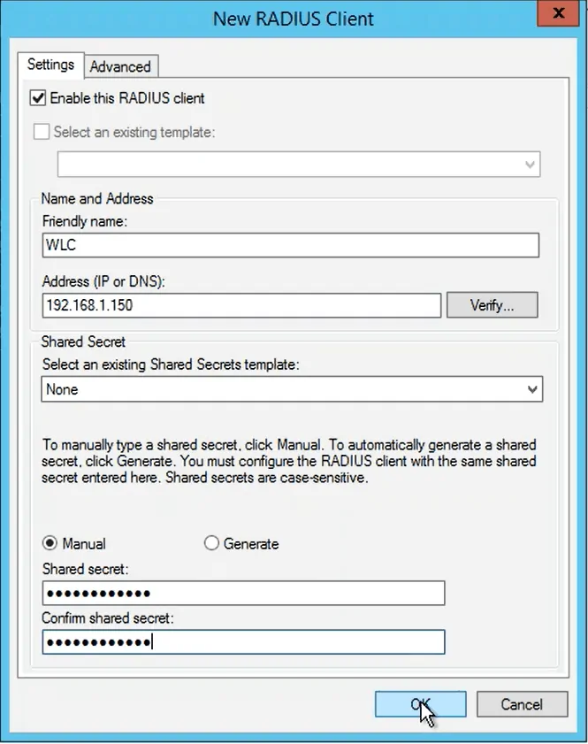 - Enter the shared secret in the Shared secret and Confirm shared secret fields, and click OK.
