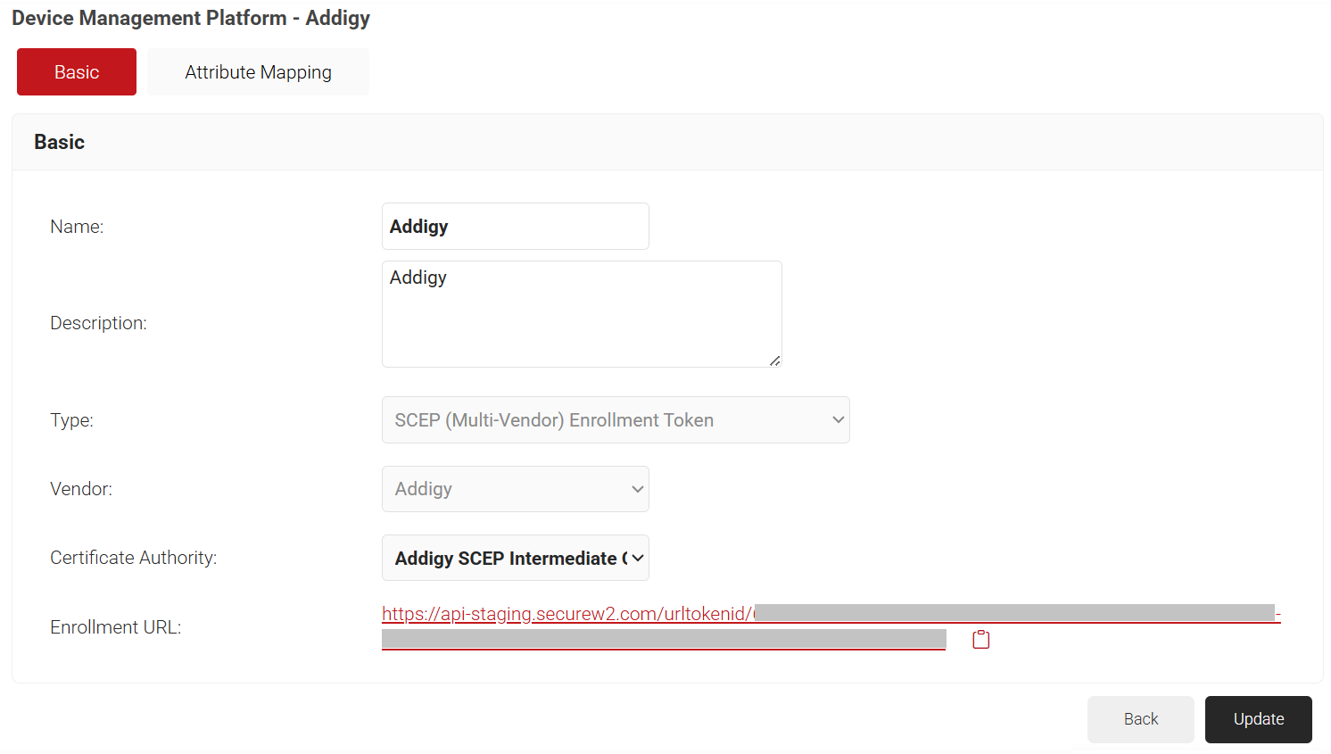 - Add the SCEP URL to the Addigy portal so you can push out configuration profiles to all Addigy devices and