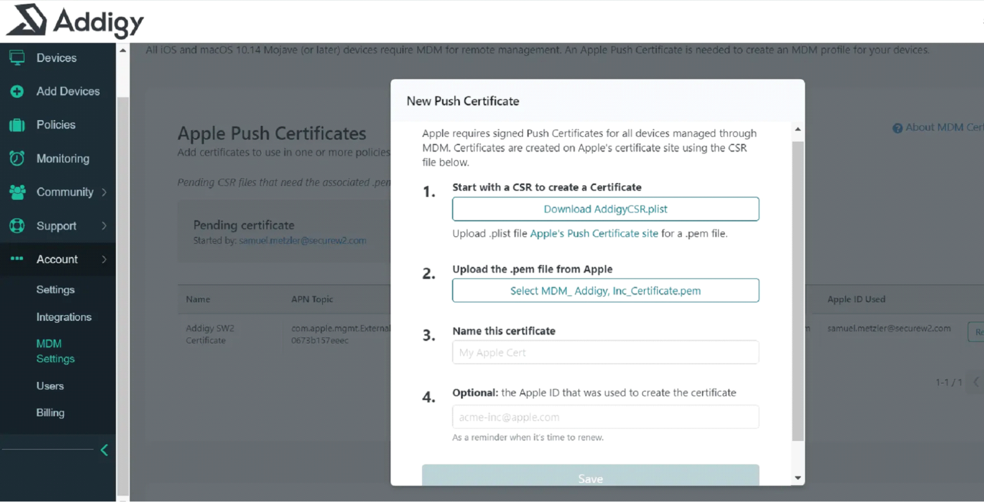 You’ll need to create Apple Push digital certificates to establish secure communications between your managed Apple devices and your certificate management system. You can create an Apple Push Certificate by downloading an Addigy Certificate Signing Request (CSR) file and uploading it to Apple.