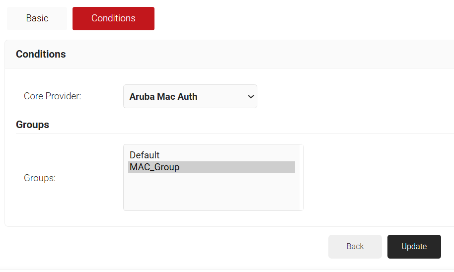 - In the Conditions section, from the Core Provider drop-down list, select the IdP you created with the MAC Authentication type.