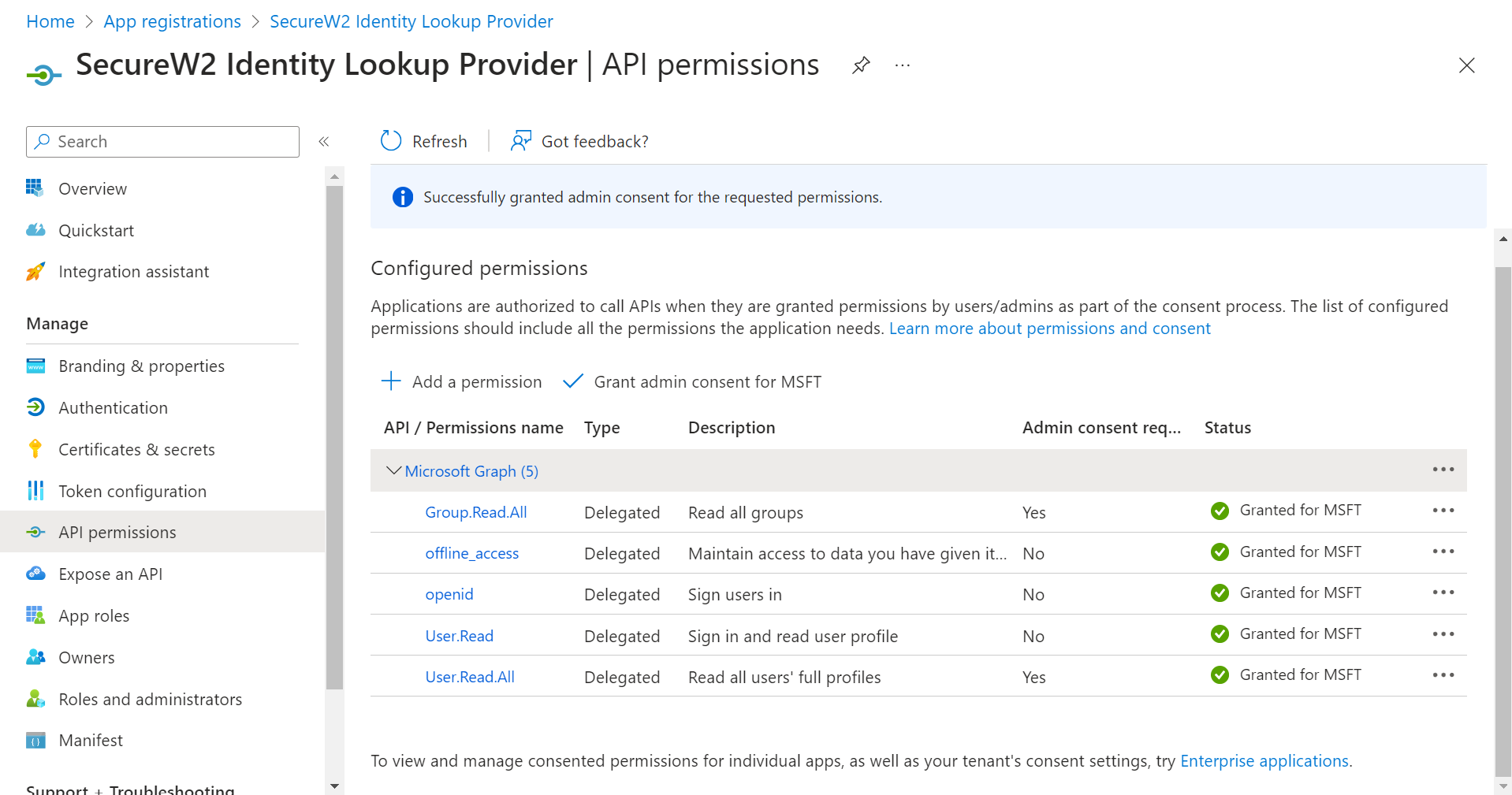 6. The configured APIs are granted consent, and the following screen is displayed.