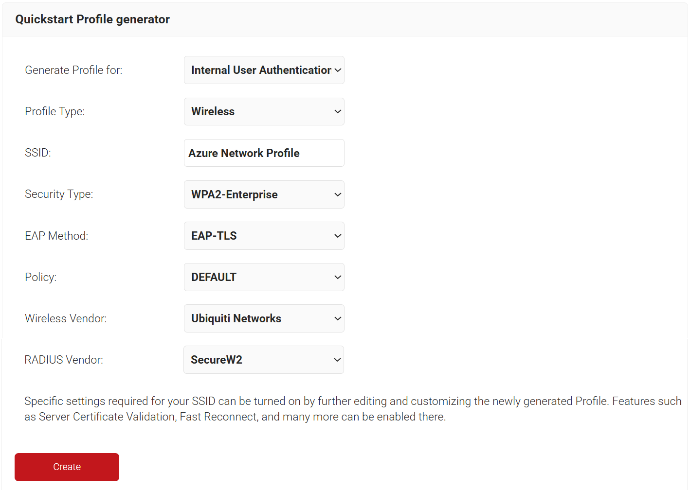 3. On the Quickstart Network Profile generator page, from the Generate Profile for drop-down list, select Internal User Authentication
