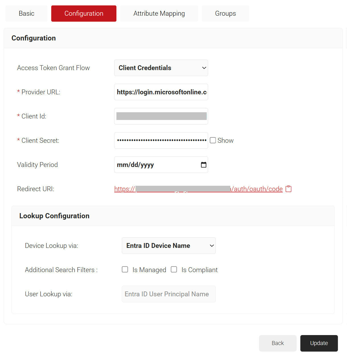 6. Under the Lookup Configuration section, from Device Lookup via drop-down list, select the required device lookup attribute from the options listed below: