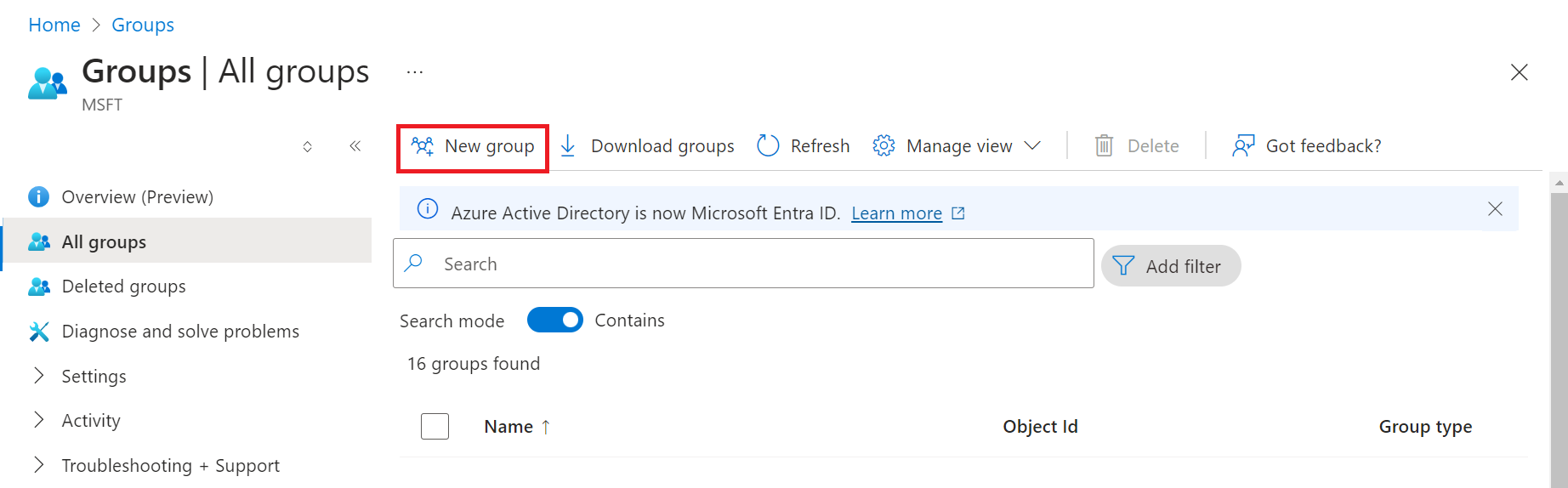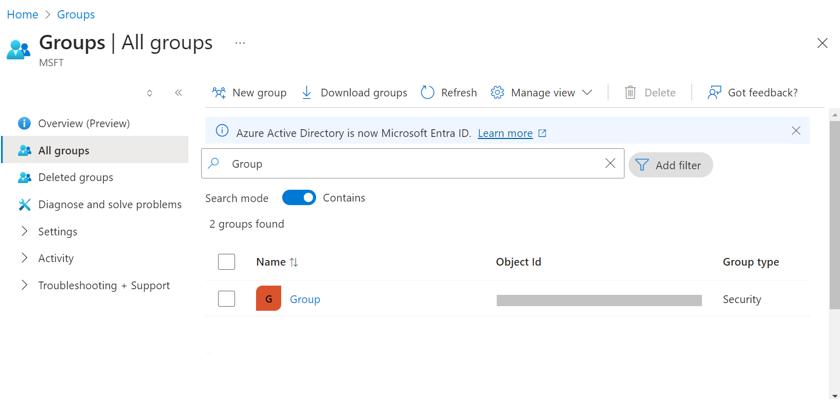 d. On the Groups screen, search for the group(s) created and copy the Object Id(s) of the group/groups to your clipboard, and save it on a word/text to be used later.