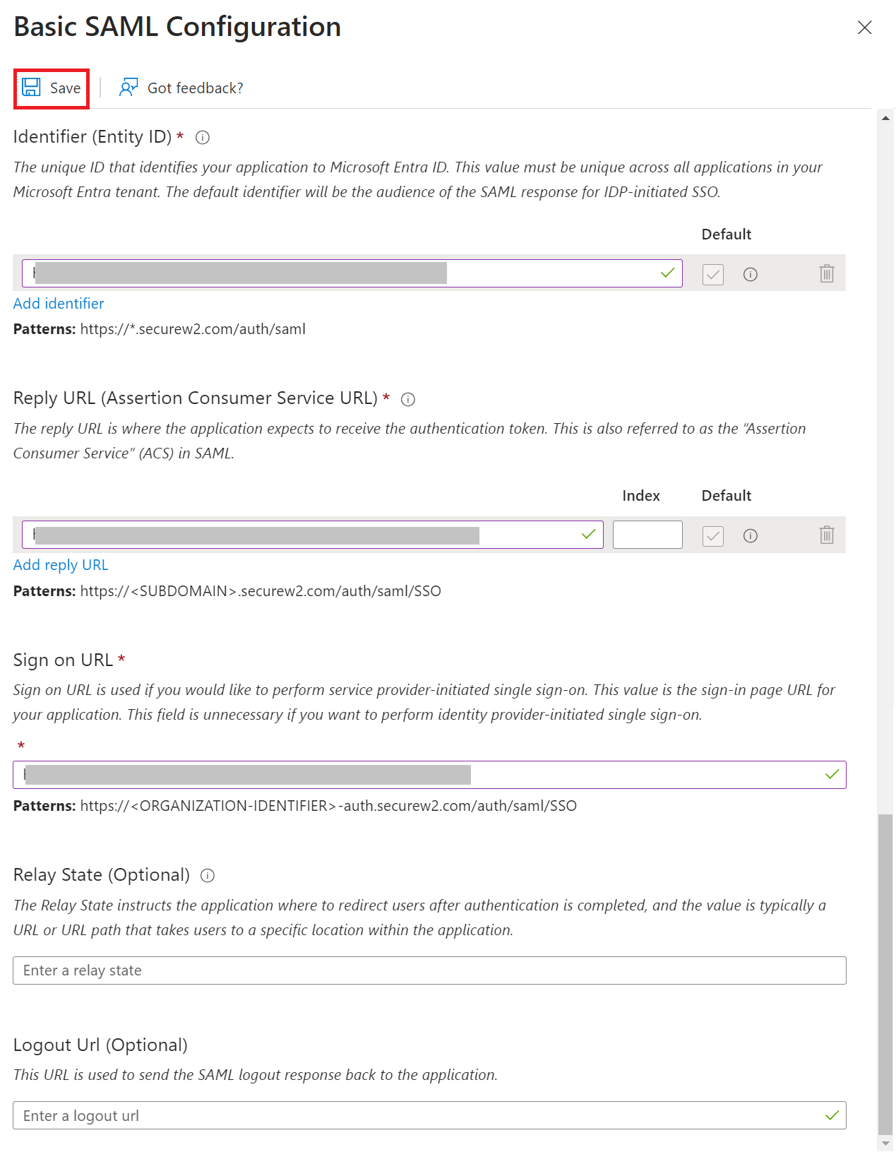 - On the Basic SAML Configuration pop-up window: