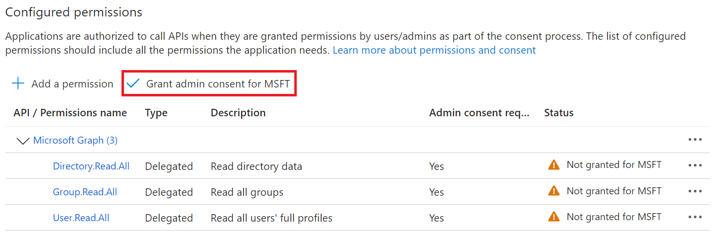 - After adding the permissions, click Grant admin consent for {your organization} to grant consent for the requested permissions.