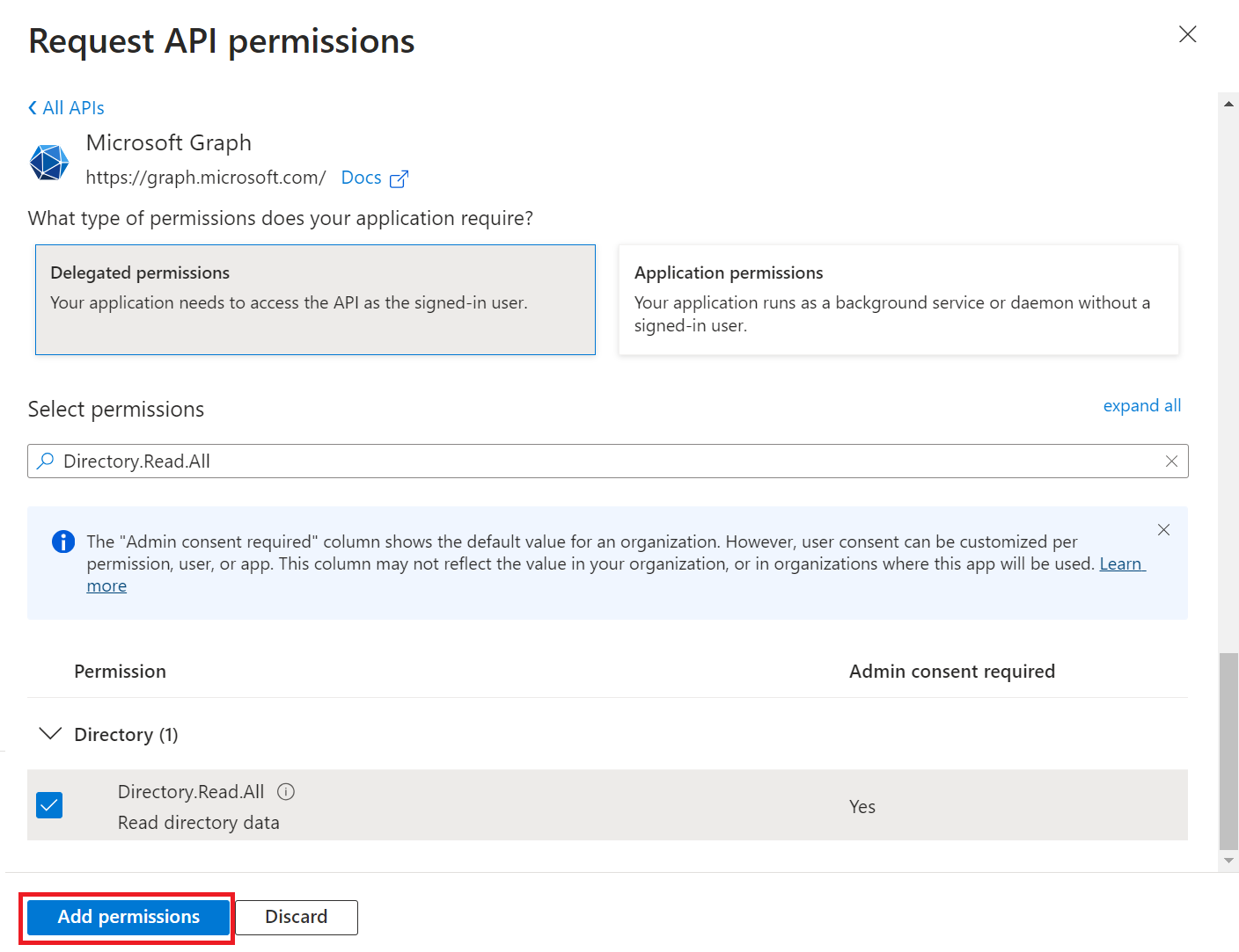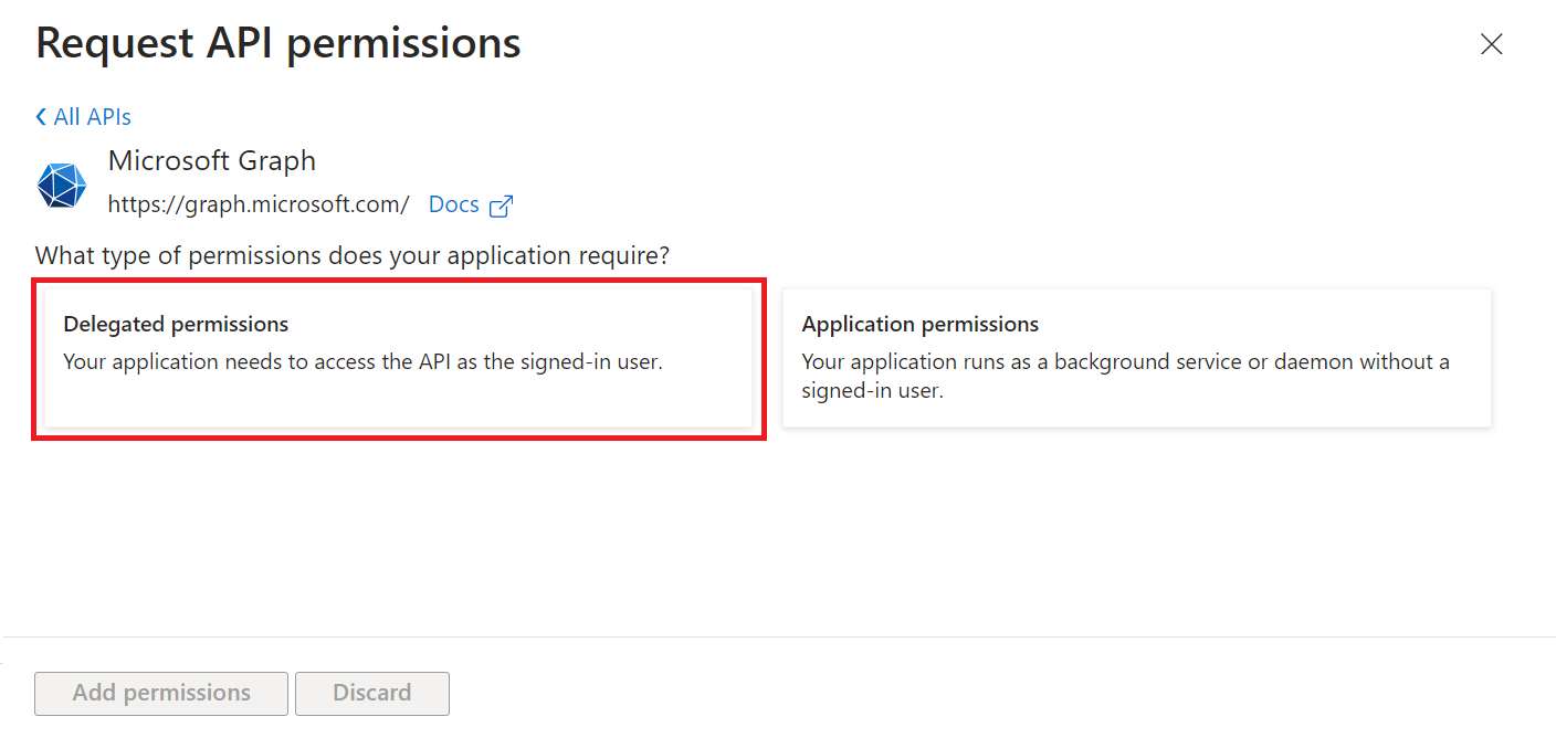 - Select Delegated permissions.