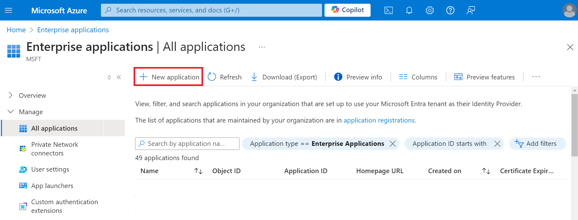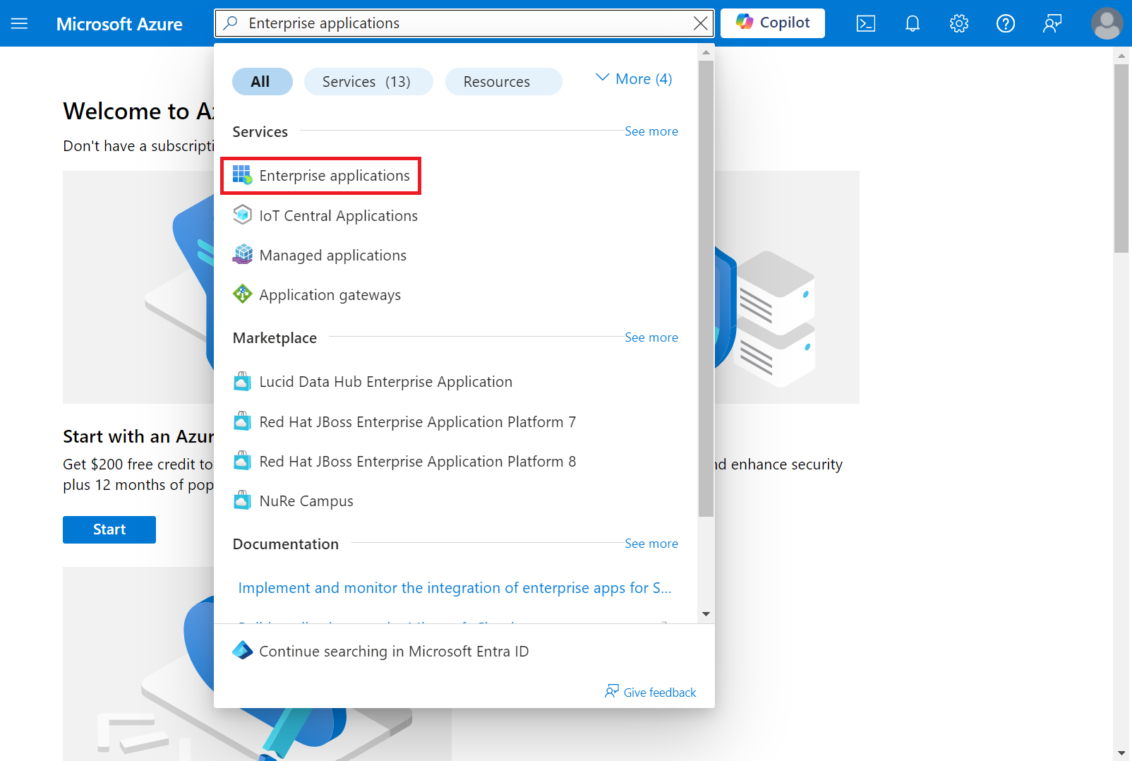 - Type “Enterprise applications” in the search box and click Enterprise applications.
