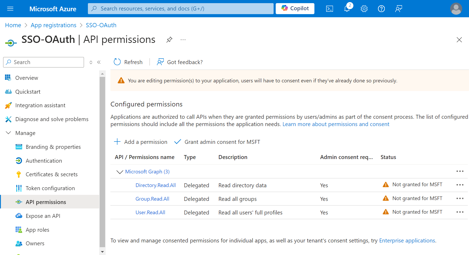 - On the displayed page, navigate to Manage > API permissions.