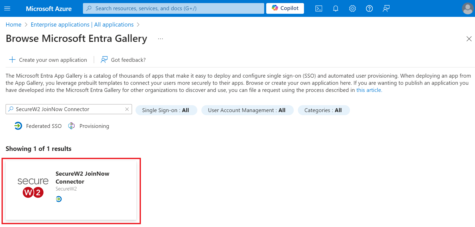 - On the Browse Microsoft Entra Gallery page, type “SecureW2 JoinNow Connector” and select SecureW2 JoinNow Connector.