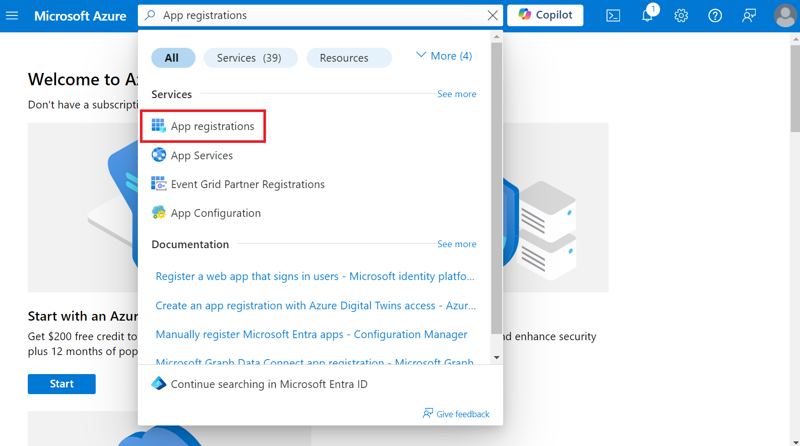 - Type “App registrations” in the search box and click App registrations.