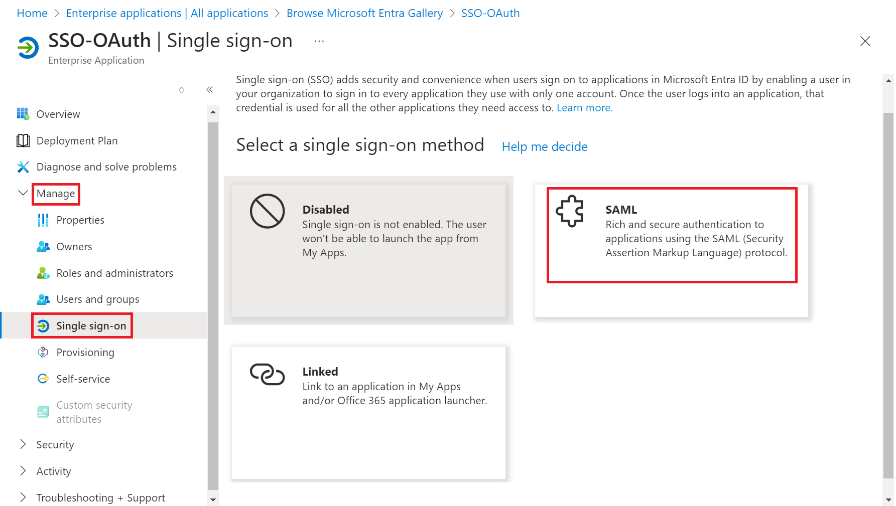 - On the left pane, navigate to Manage > Single sign-on.