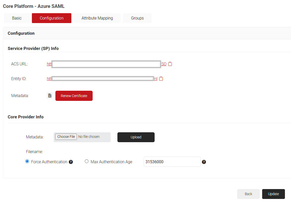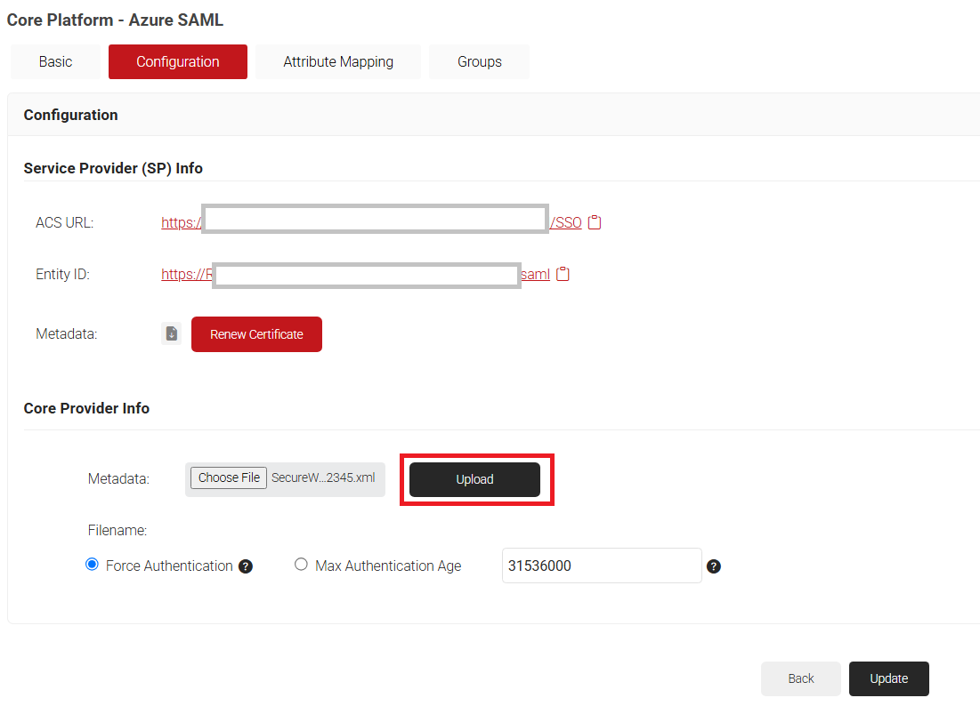 - In the Core Provider (IDP) Info section, click Choose File to select the Metadata XML file you downloaded from Azure (refer to Configuring Single-Sign-On in Azure, step 6).