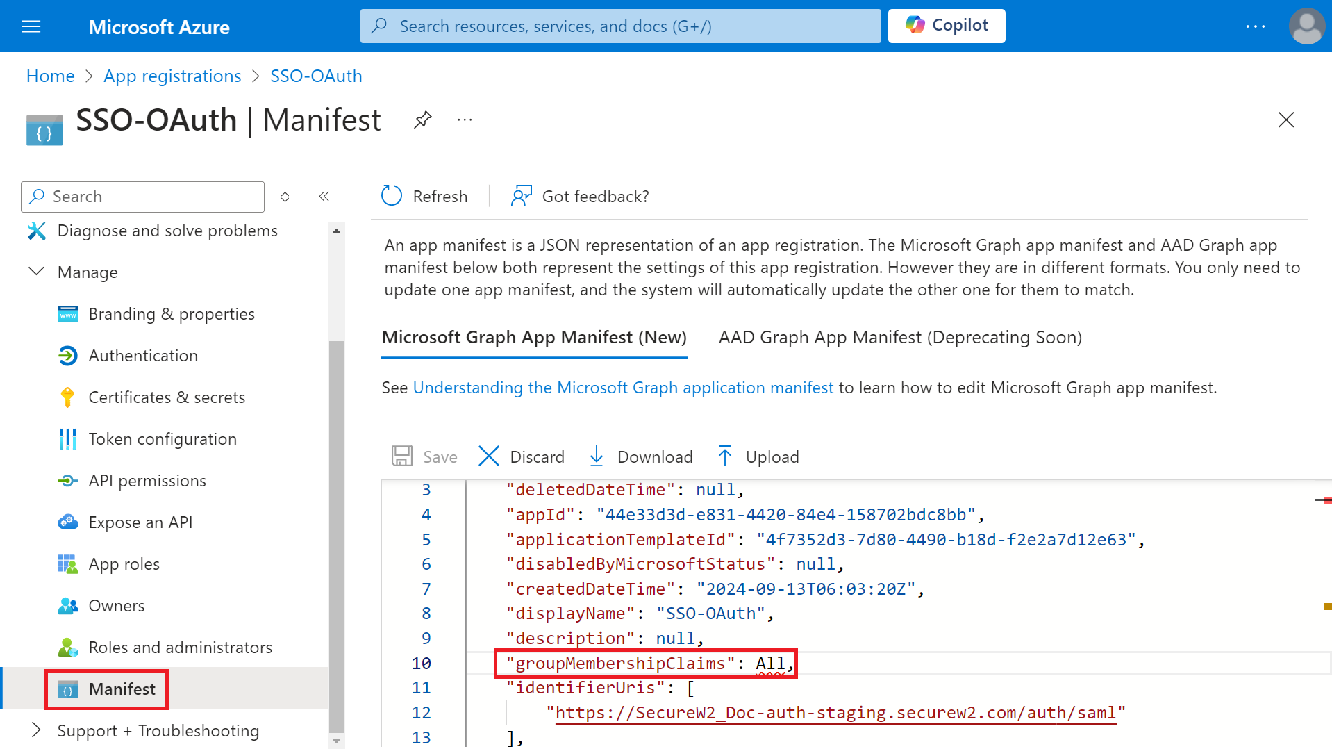 - On Microsoft Graph app manifest, change the value of the groupMembershipClaims variable to “All” in the source code.