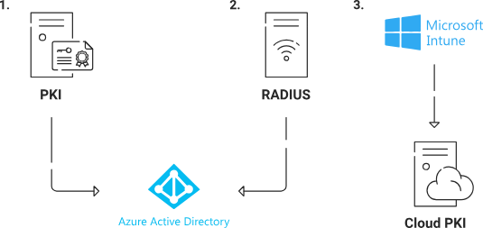 EAP-TLS (certificate-based authentication) requires a Public Key Infrastructure to enroll and manage certificates to be used for Wi-Fi. That’s why our cloud PKI and RADIUS are designed to easily integrate with Azure AD, so organizations can easily use their Azure AD for WPA2-Enterprise. Below, we break down the solution into three steps: