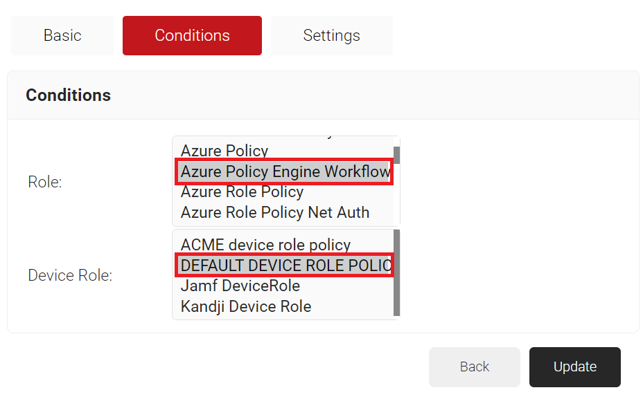 - In the Conditions section, from the Role list, select the role policy you created earlier (see the Creating a Policy Workflow section).