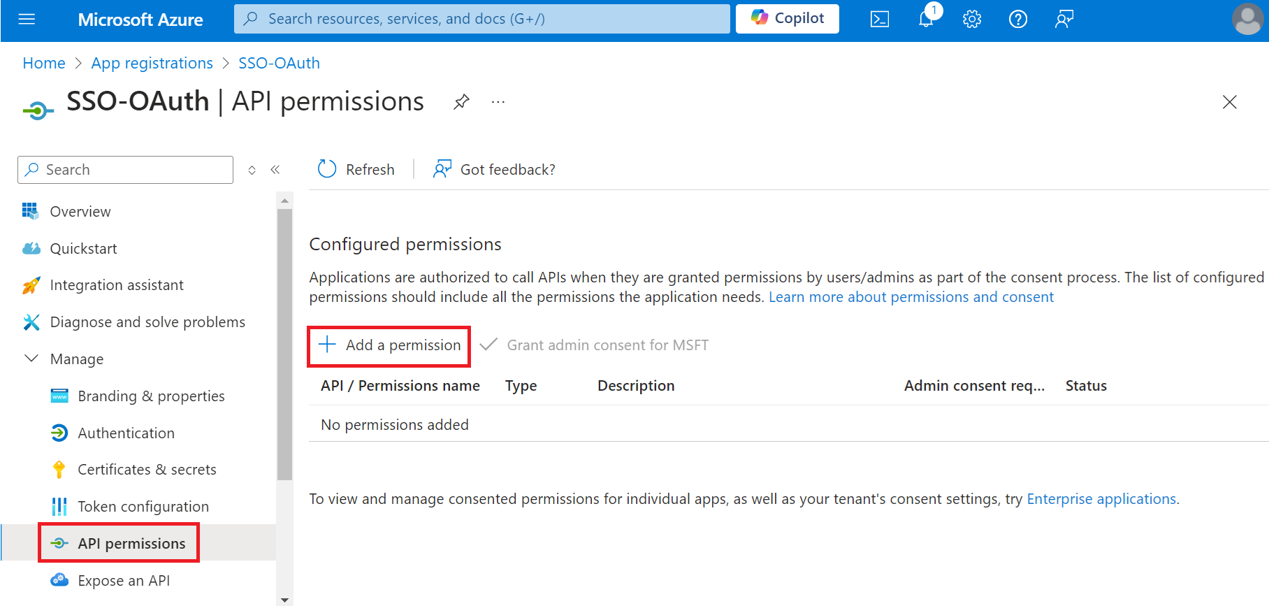 - On the API permissions screen, click Add a permission.