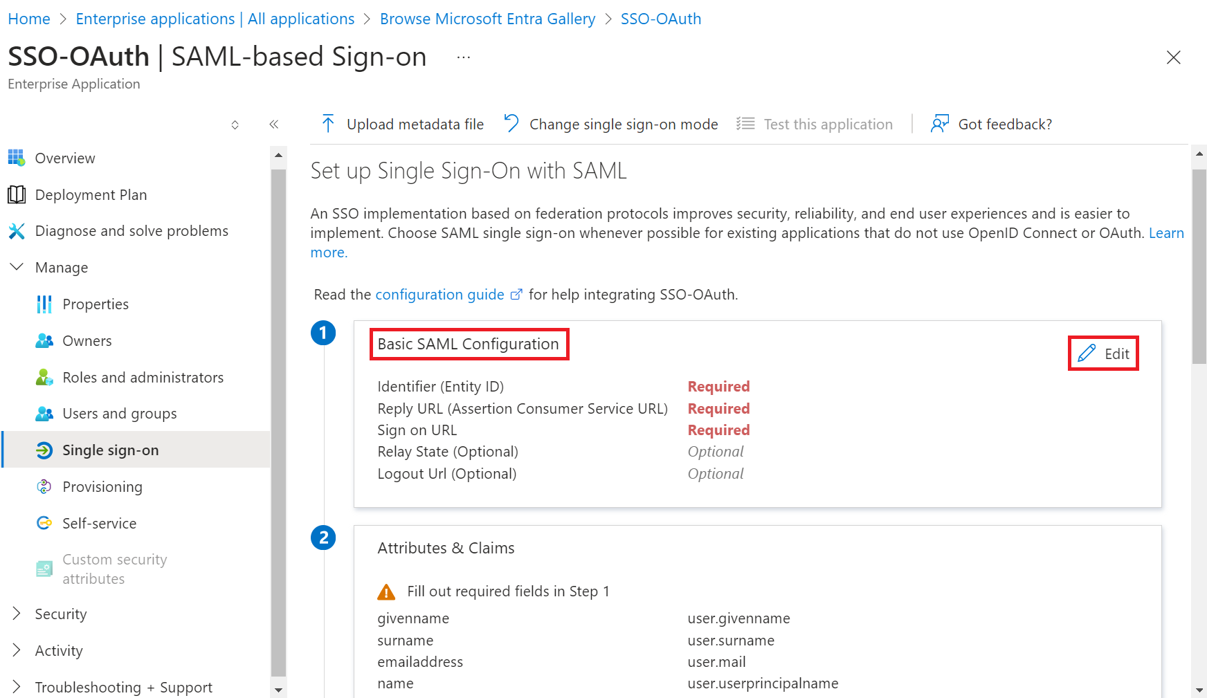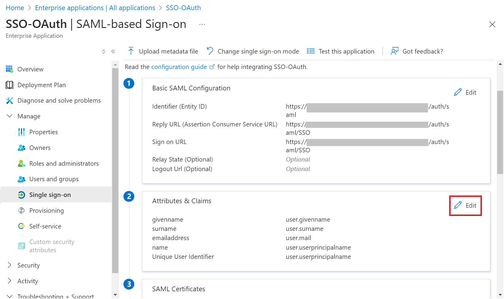 - In the Attributes & Claims section, click the Edit button.