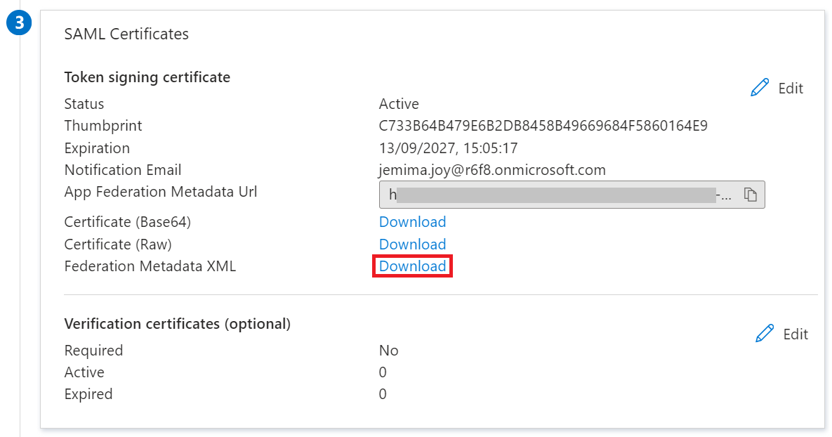 c. Click Save. - In the SAML Certificates section, click Download to obtain the Federation Metadata XML file from Azure.