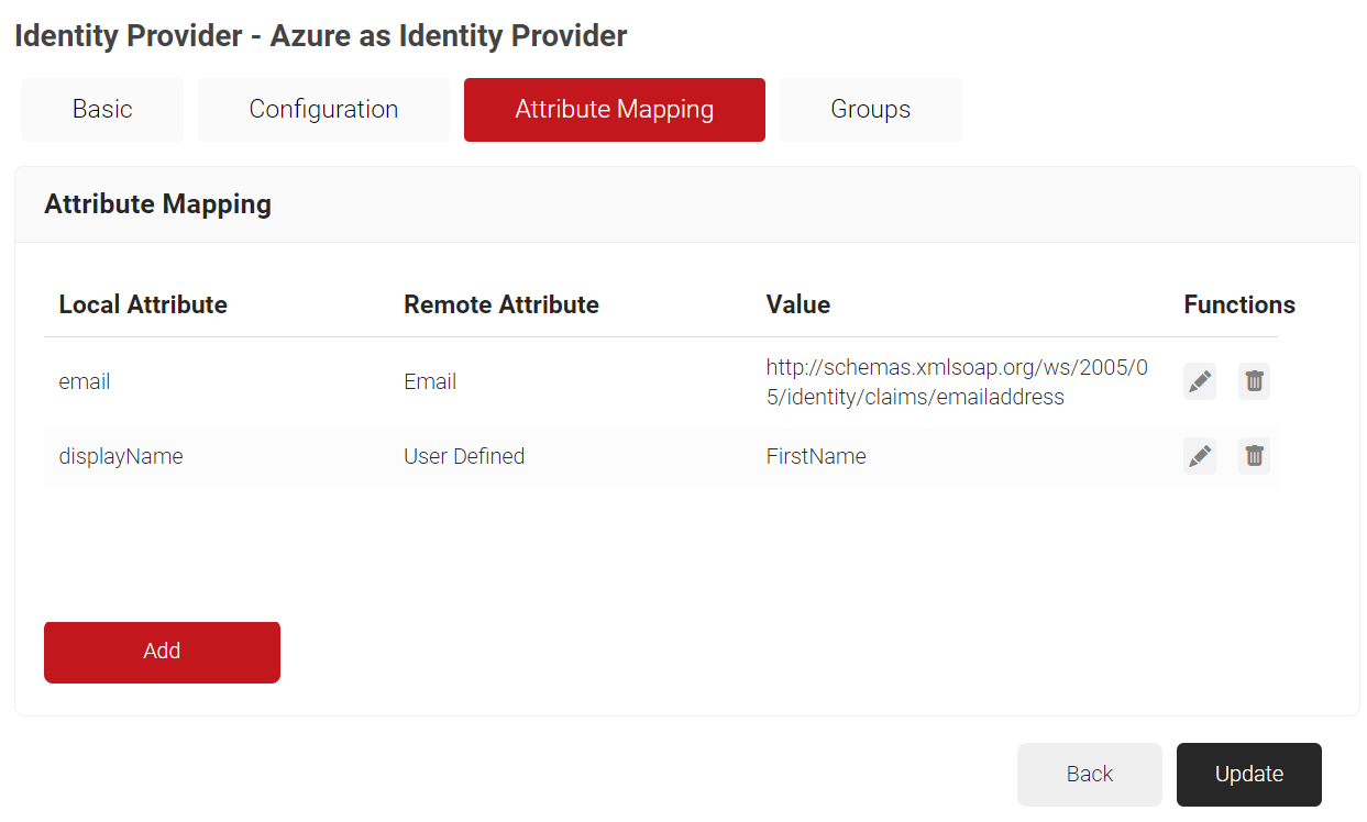 - The page refreshes and displays the Configuration, Attribute Mapping, and Groups tabs.