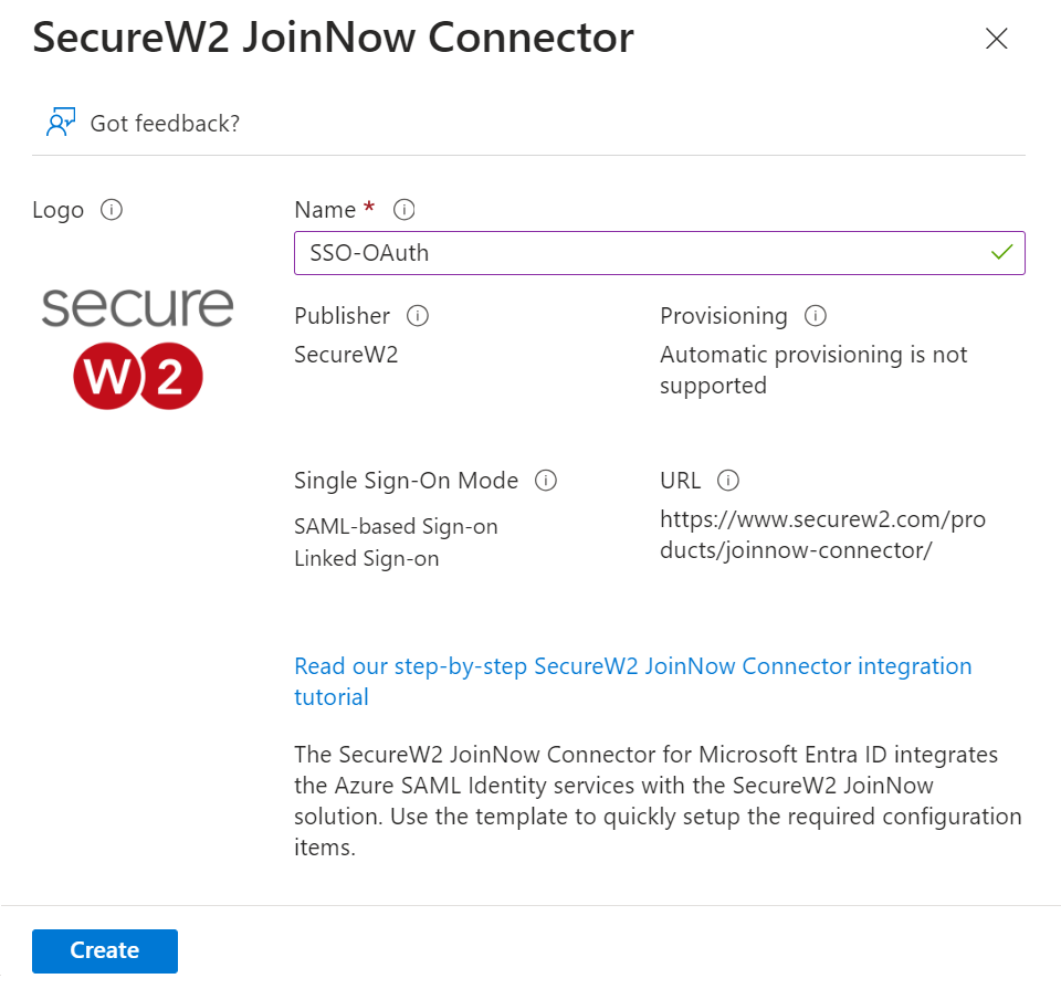 - On the SecureW2 JoinNow Connector pop-up window, enter the name of the application and click Create.