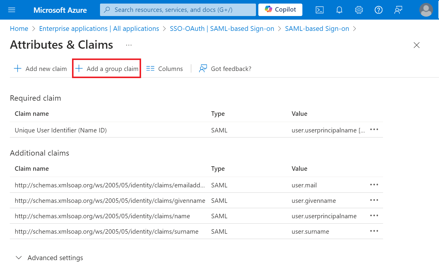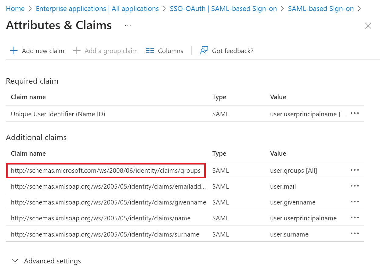 http://schemas.microsoft.com/ws/2008/06/identity/claims/groups obtained from the Configuring Group Mappings for SAML in Azure Active Directory section.