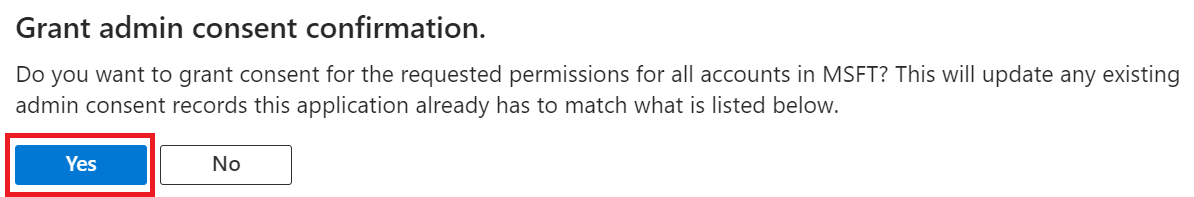 - In the Grant admin consent confirmation pop-up window, click Yes.