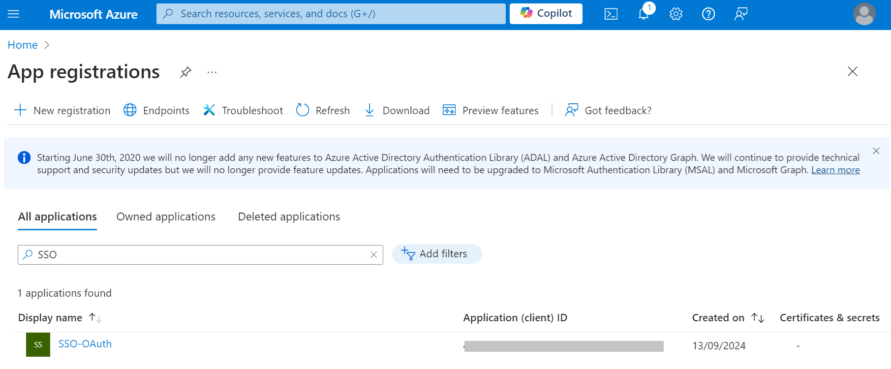 - Click the All applications tab and search for the application created in the Creating a SAML Application in Azure section and select the application.