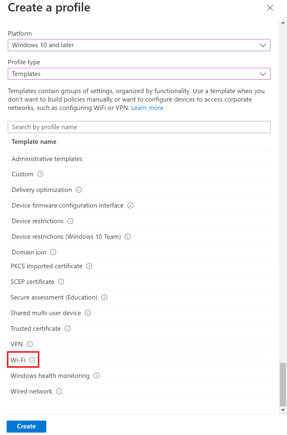 5. From the Profile type drop-down list, select Templates and then select Wi-Fi.